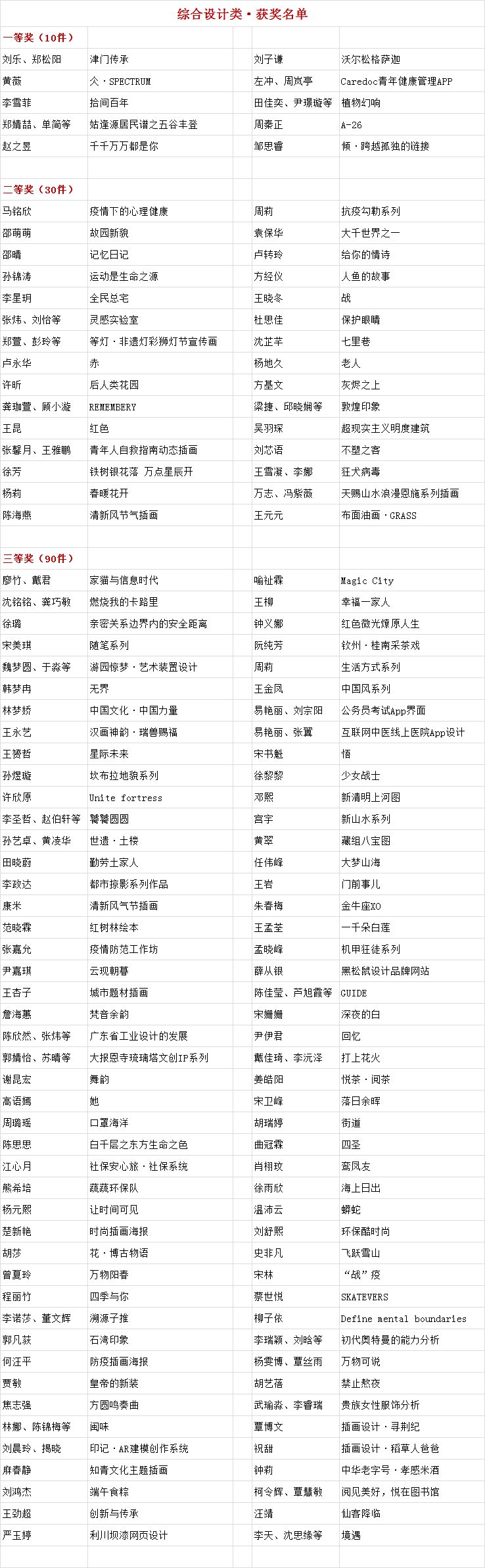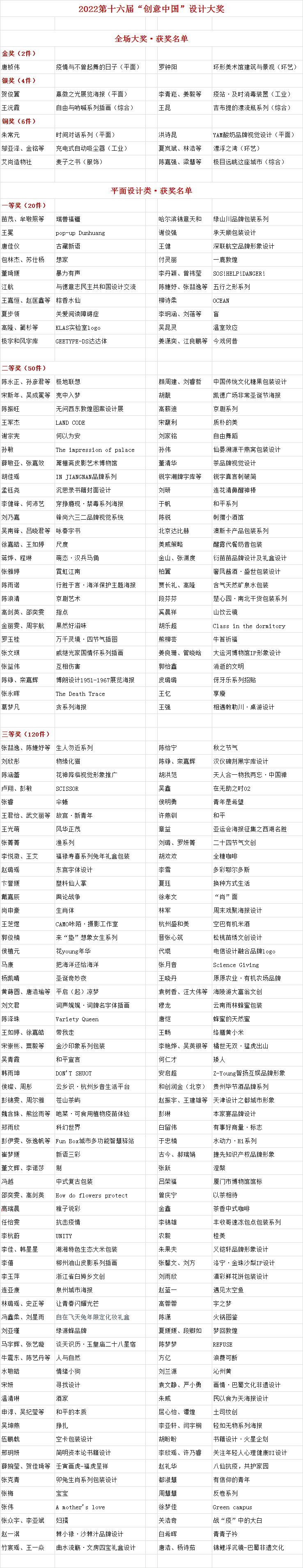 2022第十六届“创意中国”设计大奖是由北京中外视觉艺术院、中外设计研究院、中国创意同盟主办,成都蓉城美术馆办的全国性专业设计奖项,旨在展现中国创意设计领域的最新成果,推进我国设计人才的知名化、国际化进程。 本届大奖共计收到来自中国内地及港澳台地区的8927件参赛作品(有效稿件)。注重设计与艺术、科技、生态的结合,坚持多元与融合的标准,本届大奖最终评出:全场大奖作品12件;平面设计类一、二、三等奖作品共190件,优秀奖作品510件;工业设计类一、二、三等奖作品共140件,优秀奖作品245件;环艺设计类一、二、三等奖作品共230件,优秀奖作品470件;服饰设计类一、二、三等奖作品共80件,优秀奖作品200件;综合设计类一、二、三等奖获奖作品共130件,优秀奖作品333件。本届大奖等级奖的获奖率约为9%,优秀奖的获奖率约为20%。 所有获奖作者的《获奖证书》将于9月下旬通过快递寄发,请获奖作者注意接收。如获奖作者的地址、电话发生变动,请务必在9月20日之前将最新联系方式发送到组委会邮箱(ideatom@vip.163.com),以便组委会及时更新。